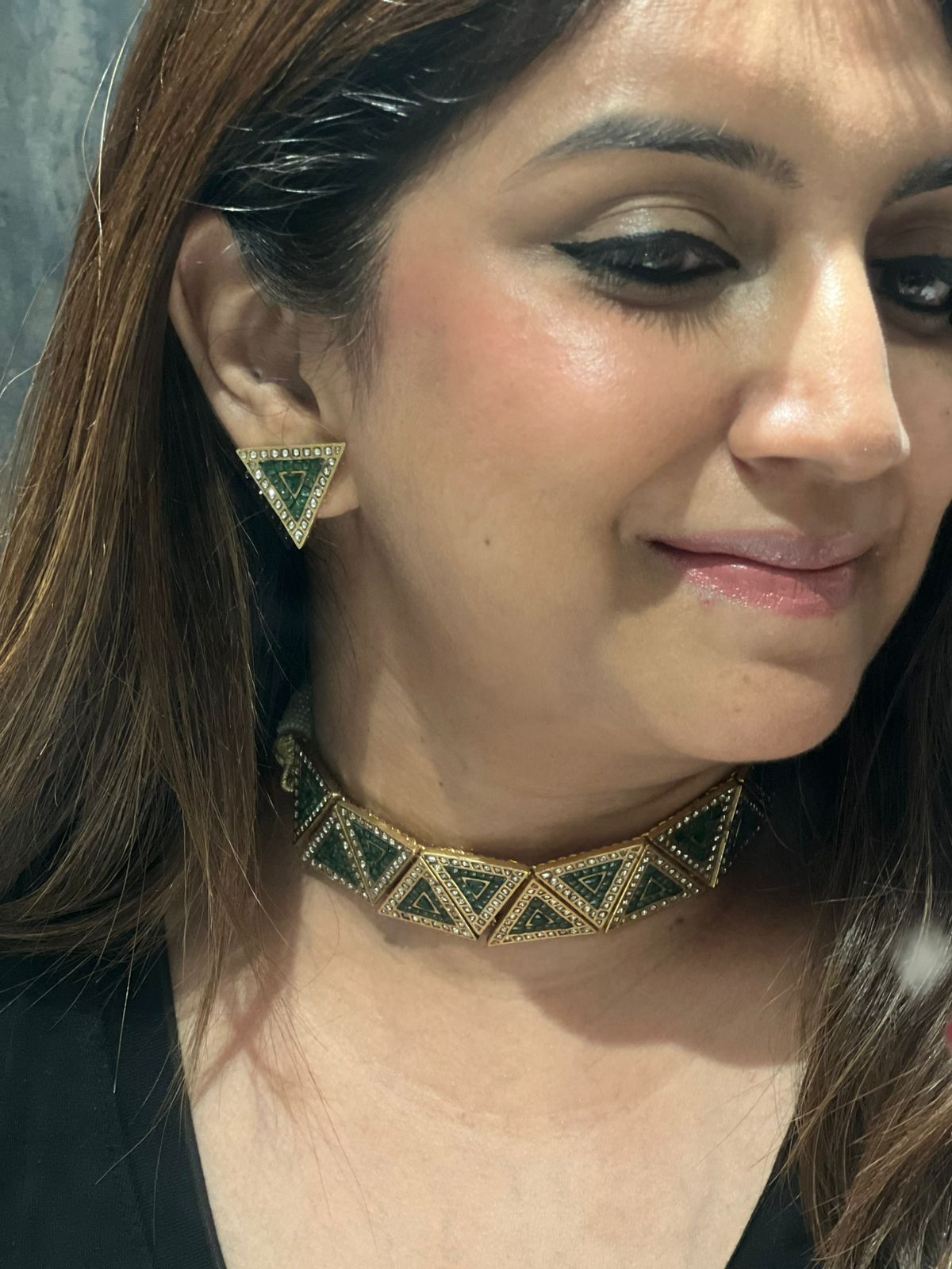 A geometric shaped polki and emerald studded choker set, very stylish yet traditional. The dramatic earrings can be styled by itself too, so can the choker with a nice satin blush pink shirt (just a little styling tip).