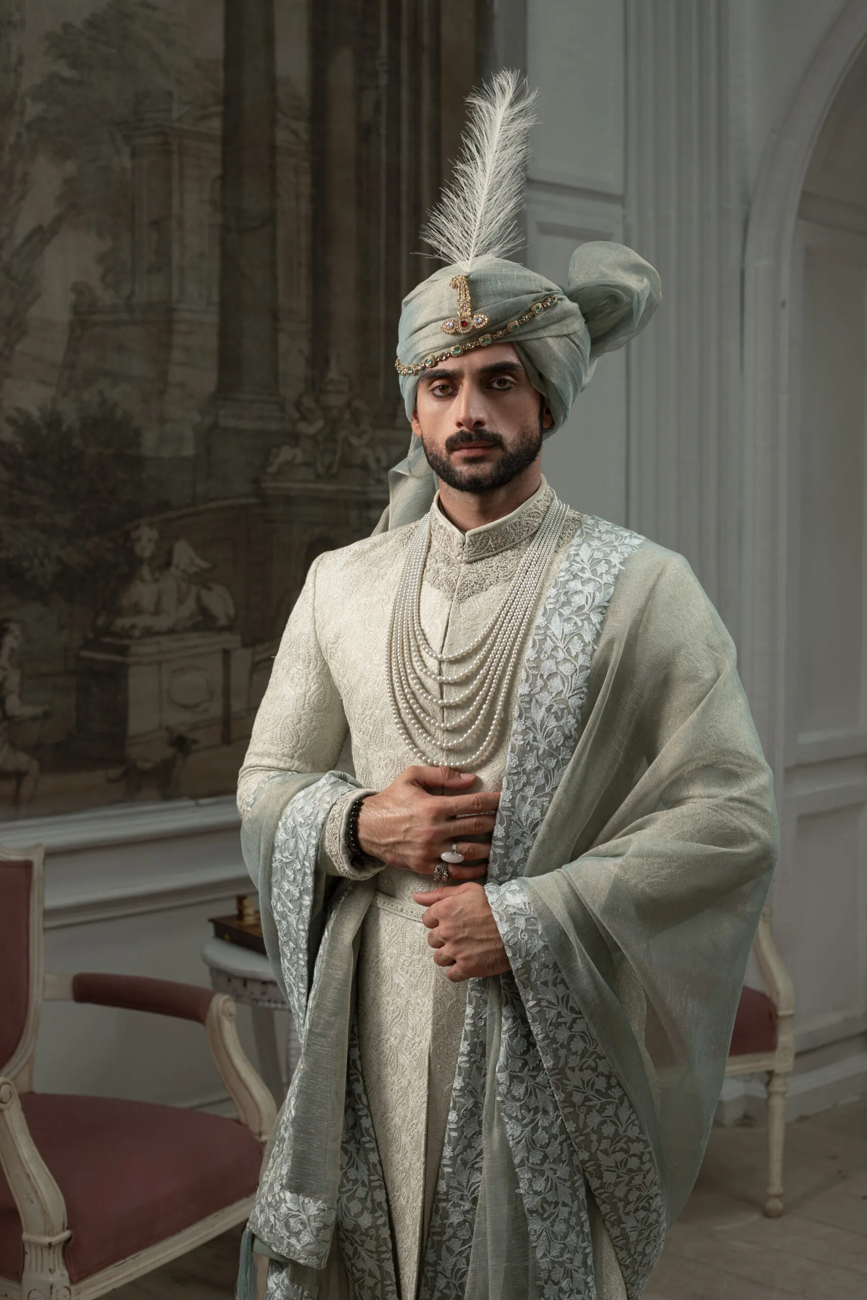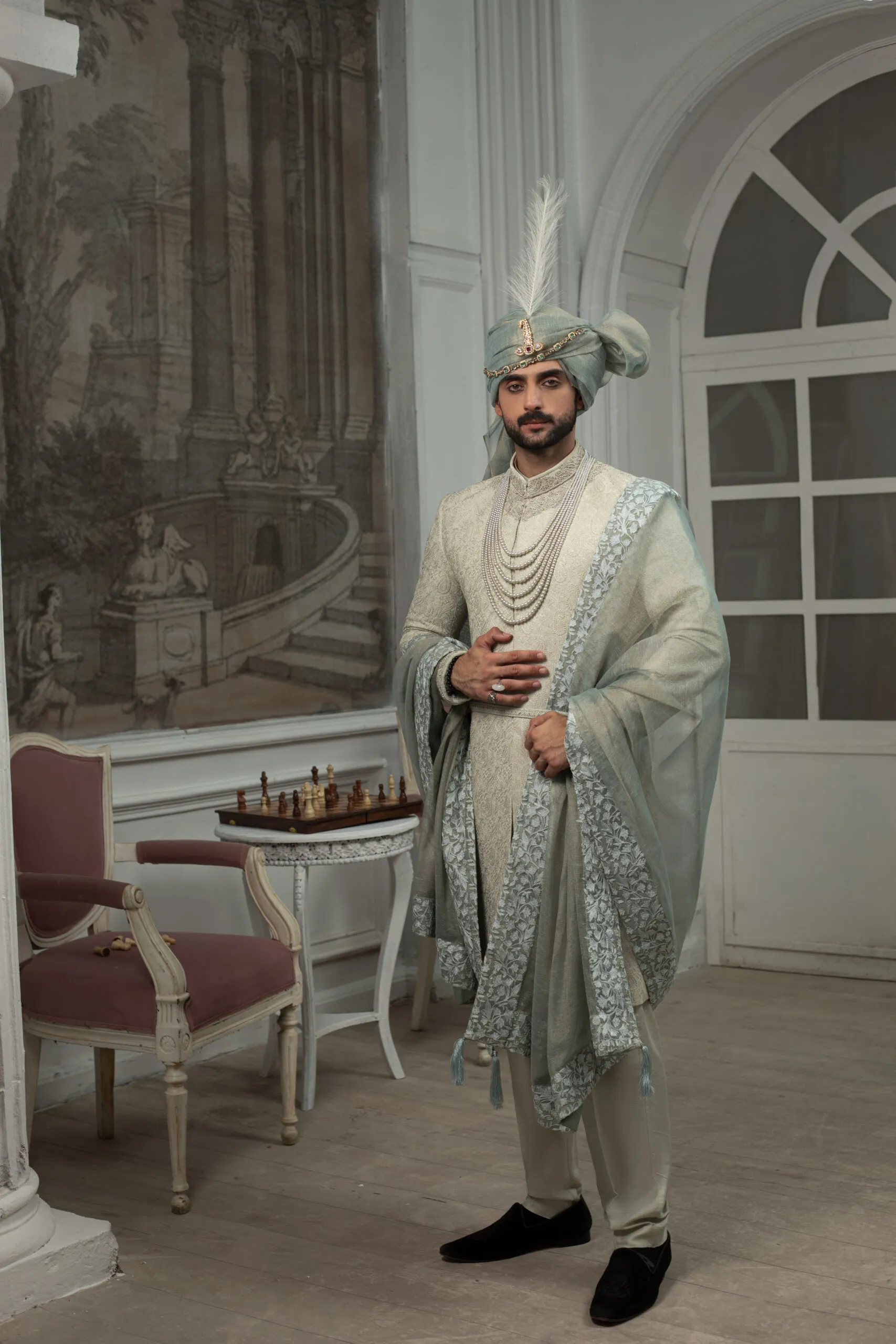 Ivory Majesty – Embroidered Groom Sherwani with Shawl